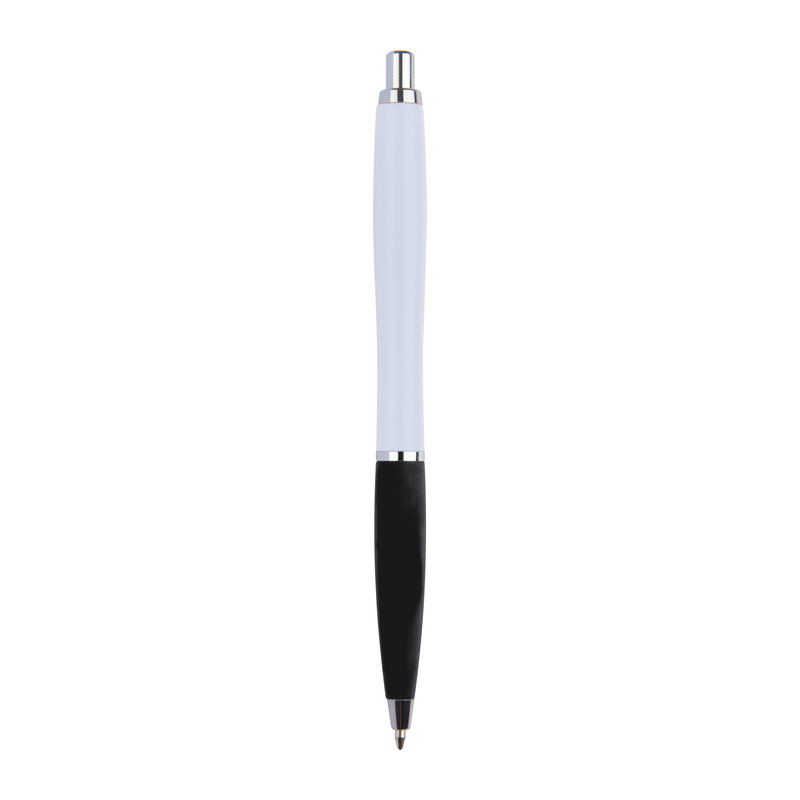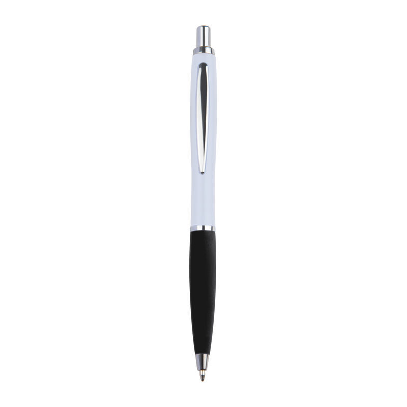 Tanka plastična kemijska olovka s plavim plastičnim punjenjem i gumenim dijelom za hvatanje. Vaš logotip bit će otisnut ispod kopče.