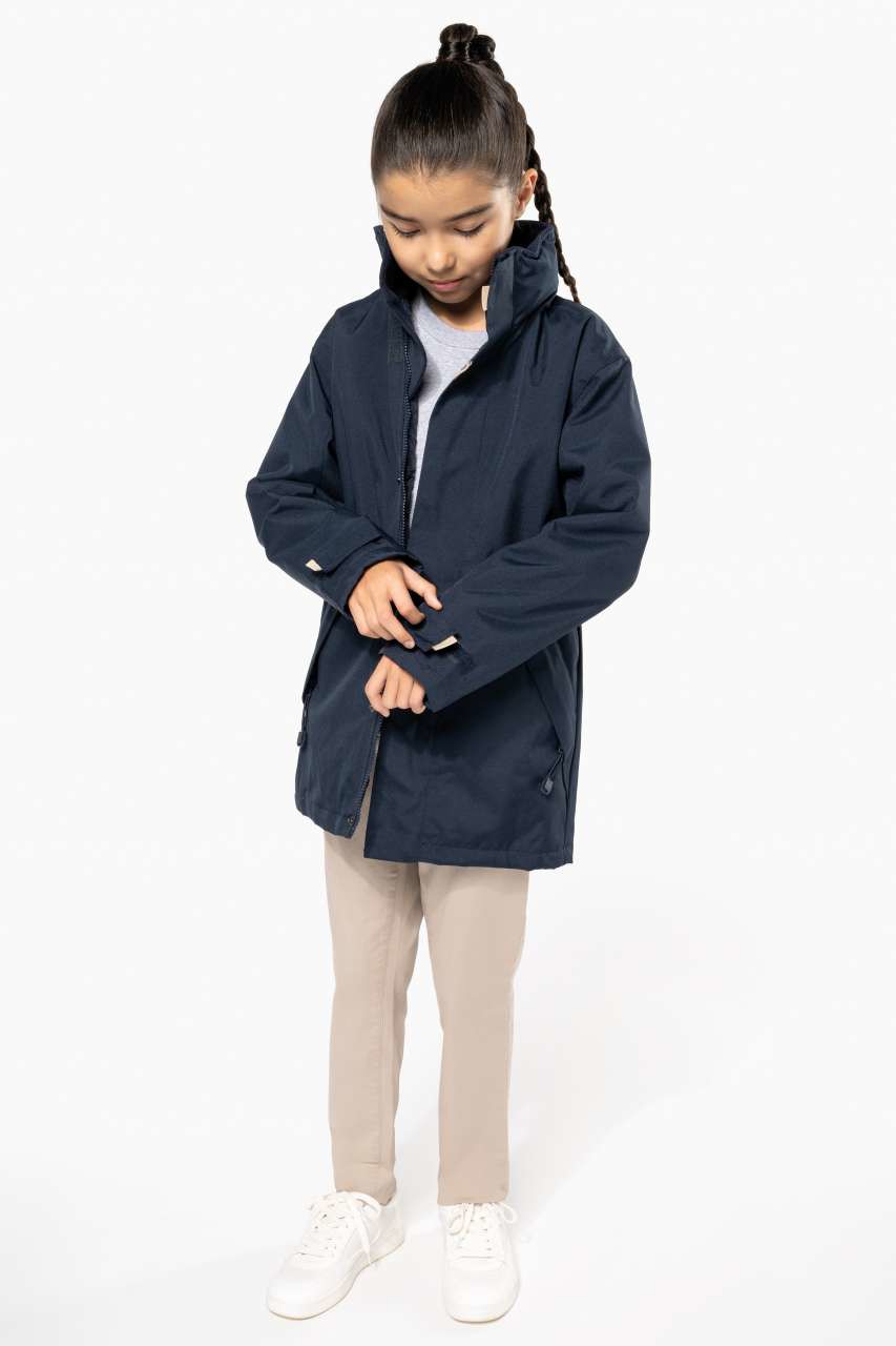 Vanjski dio od 100 % poliestera oxford 100 % prošivena podstava od poliestera Zatvarač cijelom visinom s preklopom s gumbima na pritisak i čičkom 2 bočna džepa sa zatvaračem 2 unutarnja džepa, uključujući 1 za mobilni telefon Skrivena kapuljača u ovratniku podstavljenom flisom Pristup za dodavanje ukrasa s pomoću zatvarača
