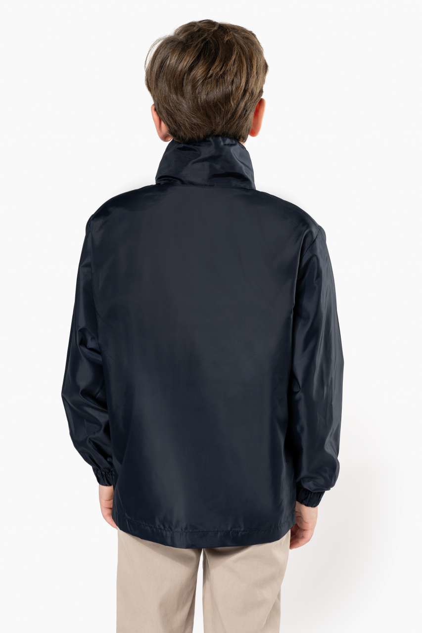 100 % poliester Patentni zatvarač cijelom visinom prednjice Skrivena kapuljača sa zatvaranjem na čičak 2 prednja džepa sa zatvaračem Elastične manšete Može se složiti u prednji džep