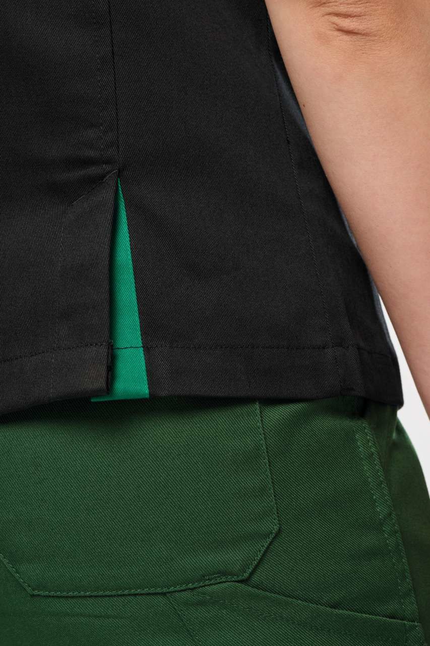 PRIJE KA6149 65 % poliester / 35 % pamuk Perivo na 60 °C 1 otvoreni prsni džep s desne strane s pretincem za olovku 1 unutarnja etiketa za ime Kontrastni patentni zatvarač na sredini prednjice i kontrastni džepovi s patentnim zatvaračem Kontrastni rubovi na ramenima Kontrastna unutrašnjost ovratnika s trakom za vješanje 2 proreza na leđima Savršena za svakodnevnu uporabu Certificirano prema STANDARDU 100 OEKO-TEX®N° CQ1007/8, IFTH