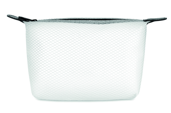 Kozmetička torbica od prozirne EVA mrežice s crnim patentnim zatvaračem.