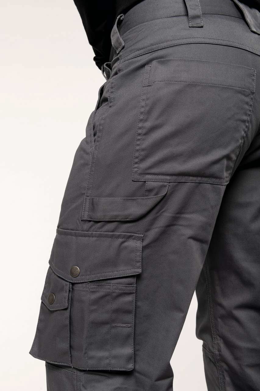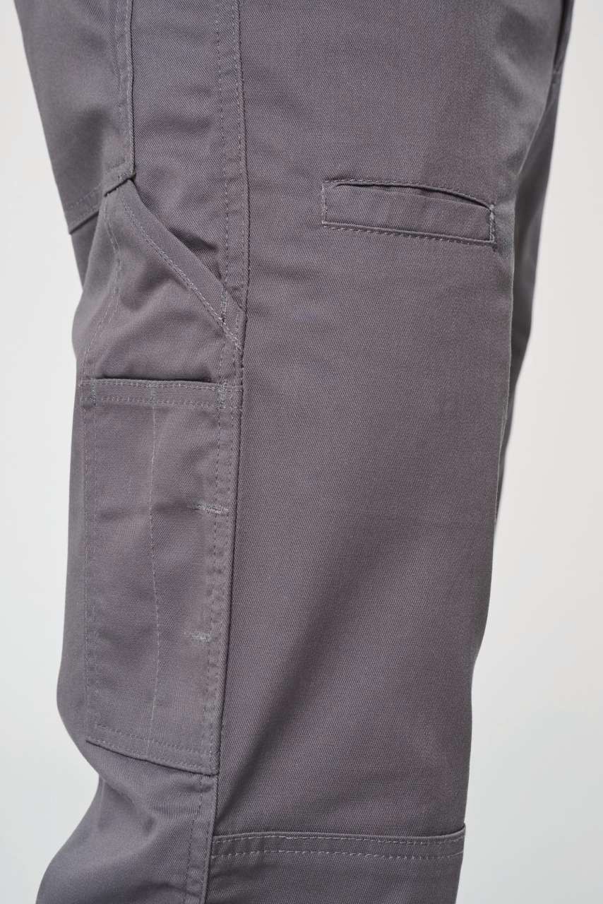 PRIJE KA795 65 % poliester / 35 % pamuk Zatvaranje patentnim zatvaračem i gumbima Ojačan šav na međunožju s trostrukim vidljivim šavovima 3 prednja džepa, 3 stražnja džepa i 1 bočni džep Savitljiva koljena za lakše kretanje Certificirano prema STANDARDU 100 OEKO-TEX®N° CQ1007/7, IFTH