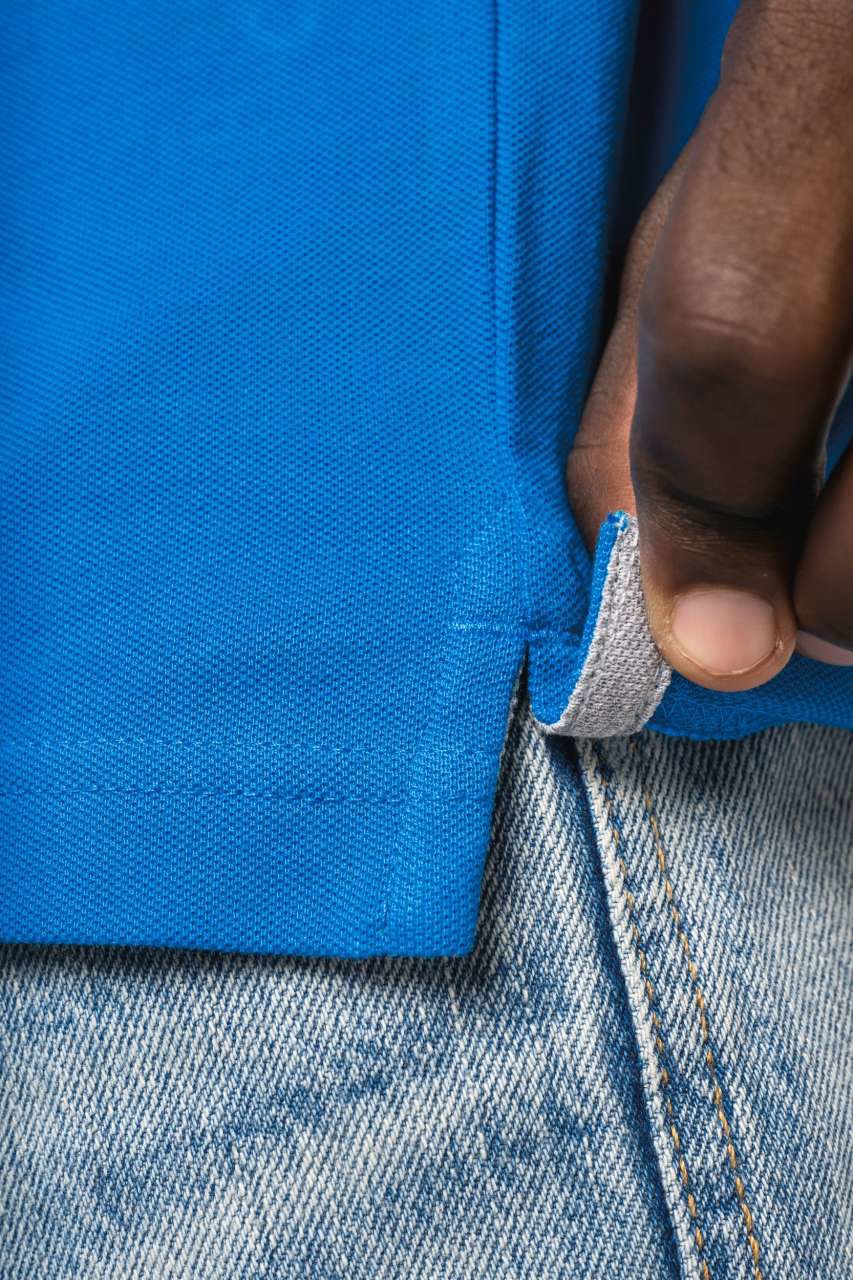 100 % četkani pamuk piqué – perivo na 60 °C (plavosiva: 90 % četkani pamučni piqué / 10 % viskoza – perivo na 40 °C) Rebrasti ovratnik i manšete Kontrastni ojačani ovratnik i bočni prorezi u plavosivoj boji za sve boje, osim tijela modela u plavosivoj boji, na kojima je ovratnik tamnosivi Prorez s 3 gumba Dvostruki šavovi na porubu Artikli tamnosive i svijetle kraljevske plave boje mogu imati različite nijanse