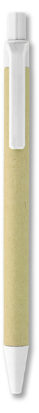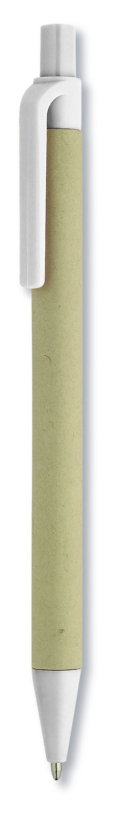 Kemijska olovka s gumbom, kućištem od recikliranog papira i PLA dijelovima (od 100% biorazgradivog kukuruza). Plava tinta.