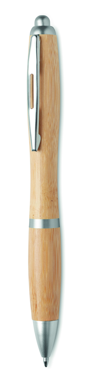 Kemijska olovka s gumbom, bambusovim tijelom i ABS priključcima. Plava tinta. Bambus je prirodni proizvod, moguće su male varijacije u boji i veličini po artiklu, što može utjecati na konačni rezultat ukrašavanja.