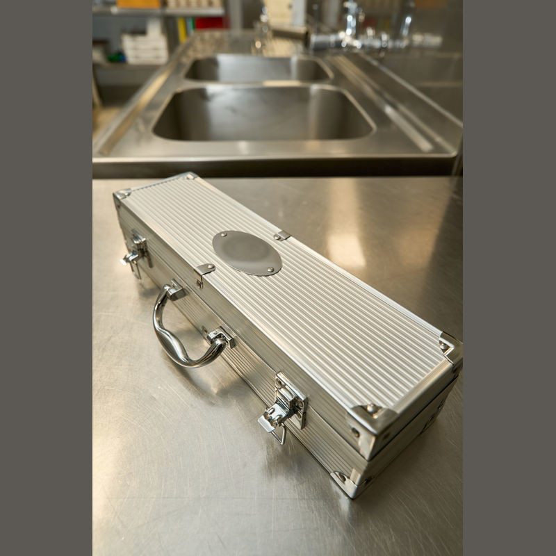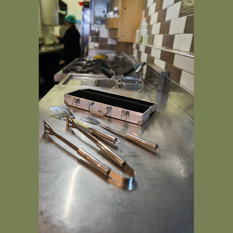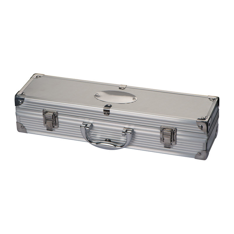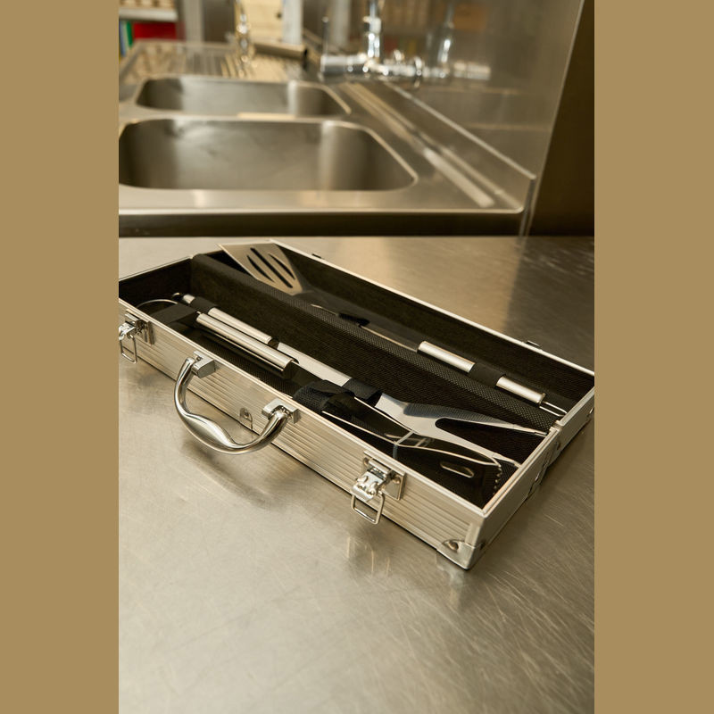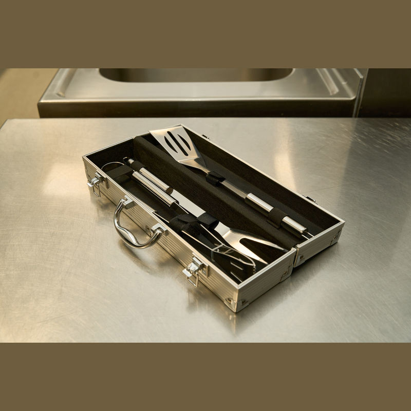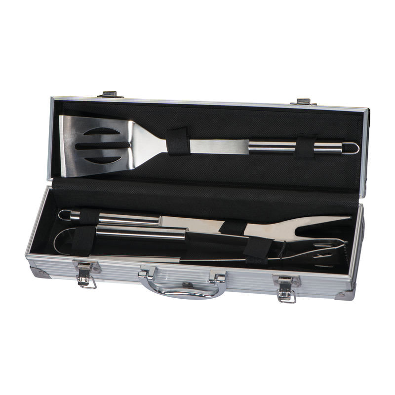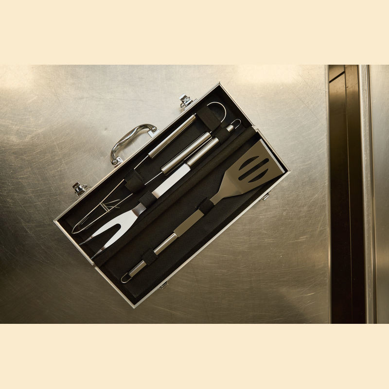 NAJBOLJA CIJENA! Kutija za roštilj koja se sastoji od hvataljke za roštilj, vilice za meso i okretnog alata za roštilj u metalnoj kutiji. Vaš logotip laserski utiskujemo na ovalnu metalnu ploču kutije.