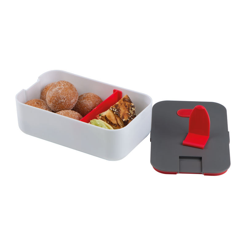 Kutija za ručak s ventilom za paru, uklonjivim pregradnim dijelom i držačem za mobitel. Kapacitet 850 ml. Pogodno za mikrovalnu pećnicu i perilicu posuđa. Napomena: Oglas nije siguran za pranje u perilici posuđa. Vaš logotip tiskamo na poklopac.