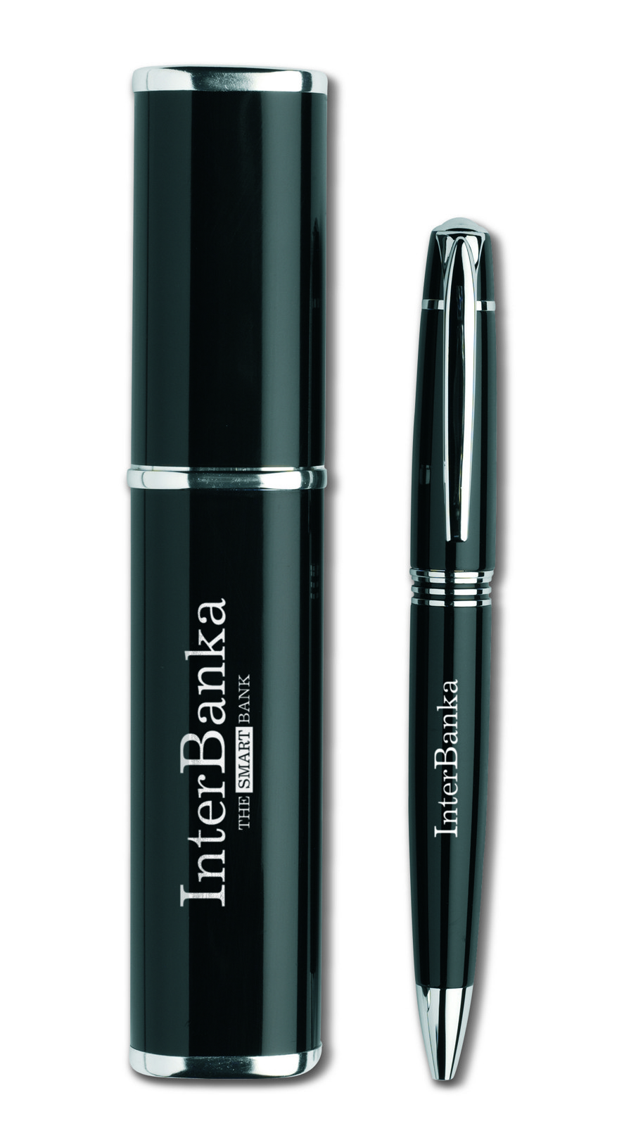 Metalna kemijska olovka s okretnim mehanizmom u aluminijskoj poklon kutijici. Metalno punjenje s crnom tintom.
