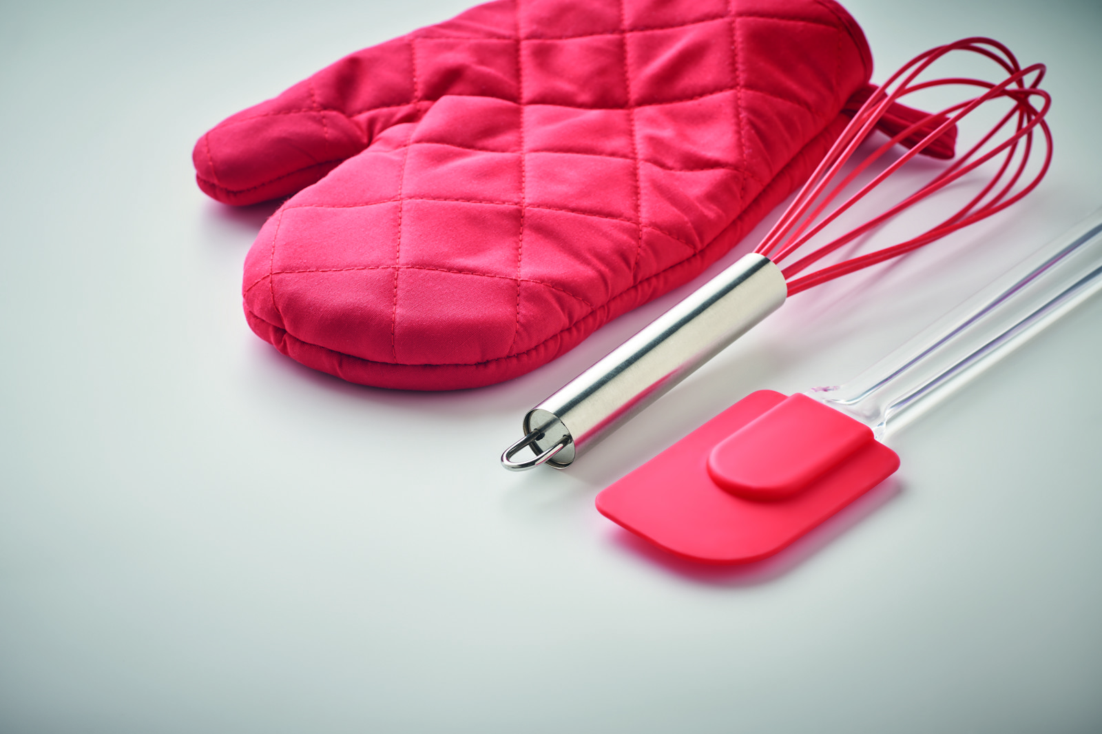 Set pribora za pečenje. Uključuje rukavicu za pećnicu od polipamuka (95% poliestera i 5% pamuka), pjenjaču i lopaticu od silikona.