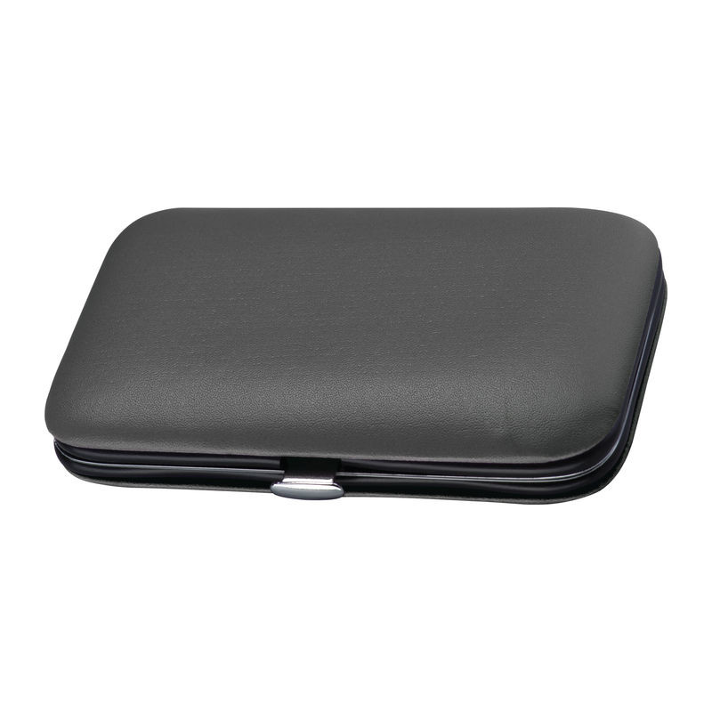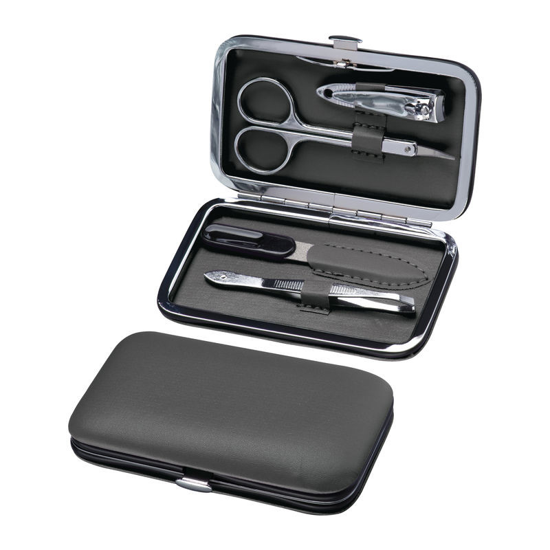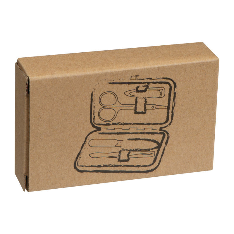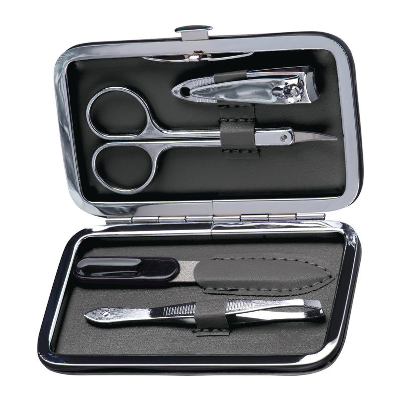 Set za manikuru u PVC kutijici s metalnim okvirom uključuje škare za nokte, turpiju za nokte, rezače za nokte i pincetu. Tiskamo vaš logotip na kutijicu.