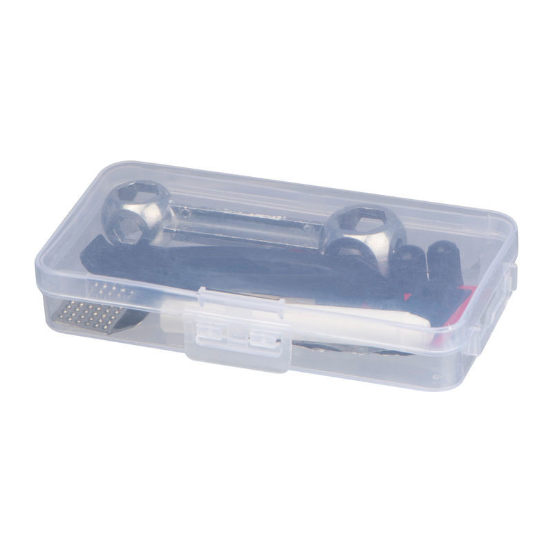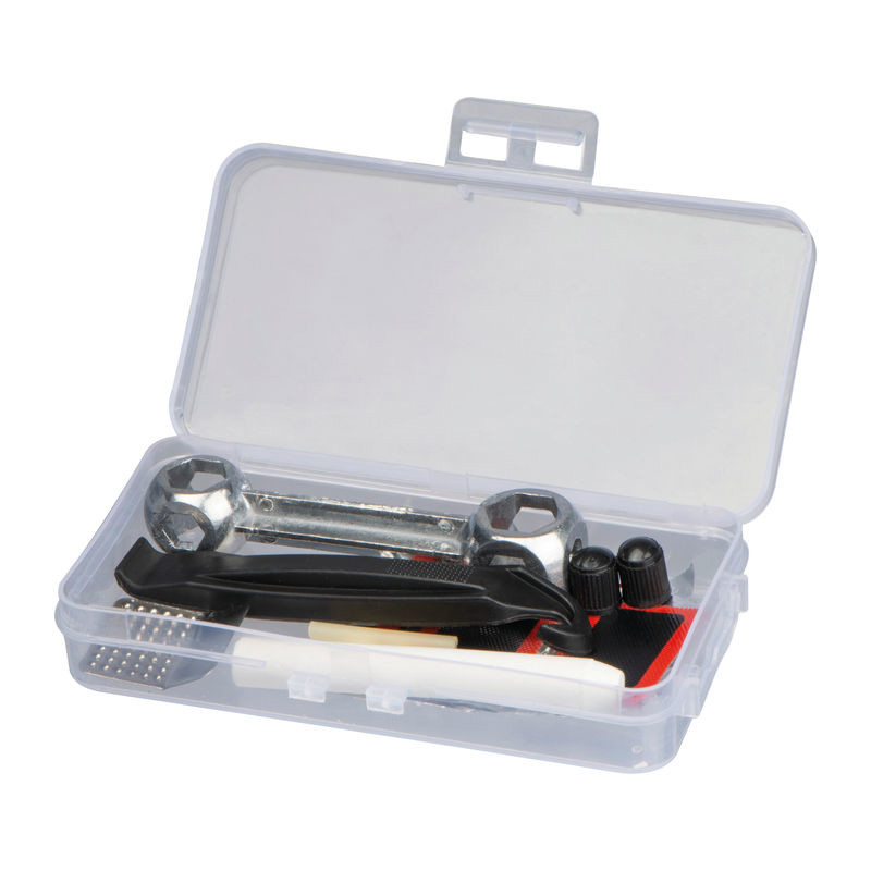 Komplet za popravak bicikla koji se sastoji od dvije zračnice s ventilima, ribeža, poluge za gume, dva čepa za ventile, pet zakrpa za popravak, bojice i ključa. Vaš logotip ćemo otisnuti na kutiju.