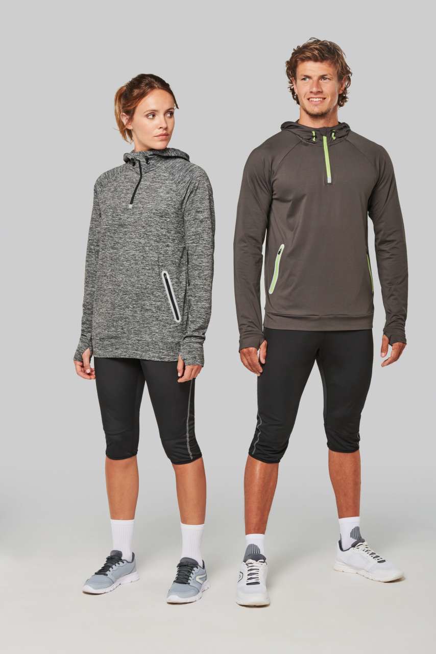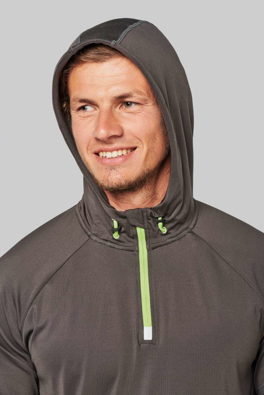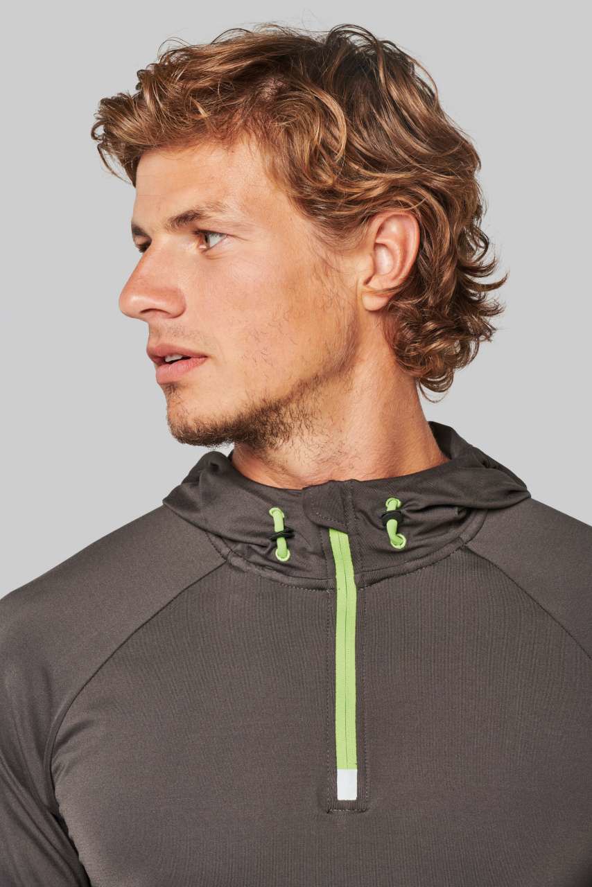 90 % poliester / 10 % elastin Iznimno mek četkani žersej Raglan rukavi 2 reflektirajuća džepa s patentnim zatvaračem Bijeli patentni zatvarači na modelima tamnoplave boje, crni patentni zatvarači i uzice na modelima crvene boje te sportsko sivi-bež i zeleni zatvarači i uzice na modelima tamnosive boje