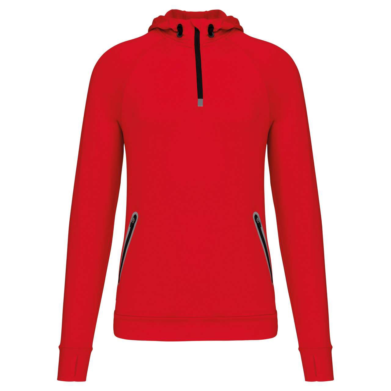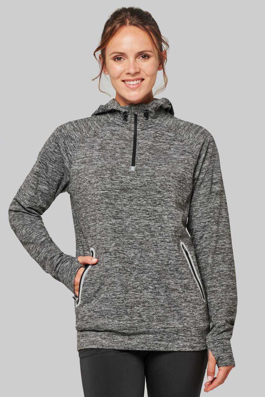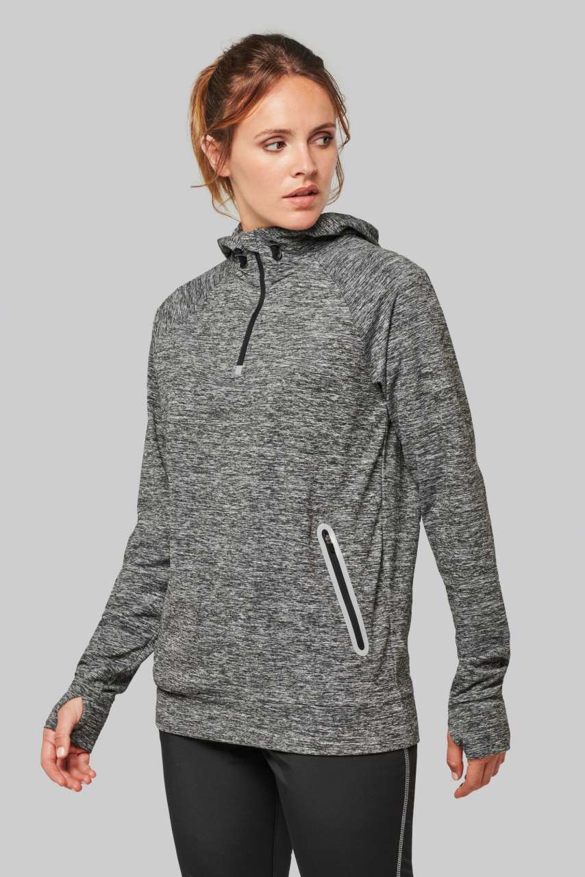 90 % poliester / 10 % elastin Iznimno mek četkani žersej Raglan rukavi 2 reflektirajuća džepa s patentnim zatvaračem Bijeli patentni zatvarači na modelima tamnoplave boje, crni patentni zatvarači i uzice na modelima crvene boje te sportsko sivi-bež i zeleni zatvarači i uzice na modelima tamnosive boje