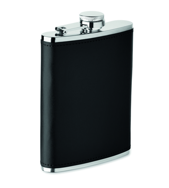 Tanka pljoska od nehrđajućeg čelika s poklopcem od PU kože. Kapacitet 200 ml.