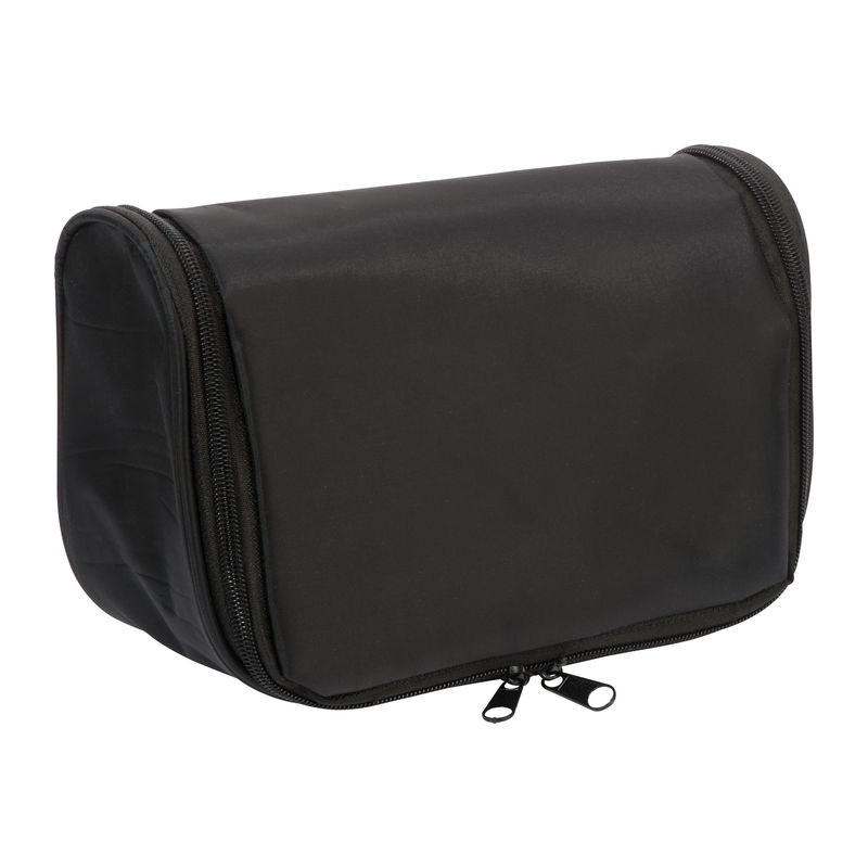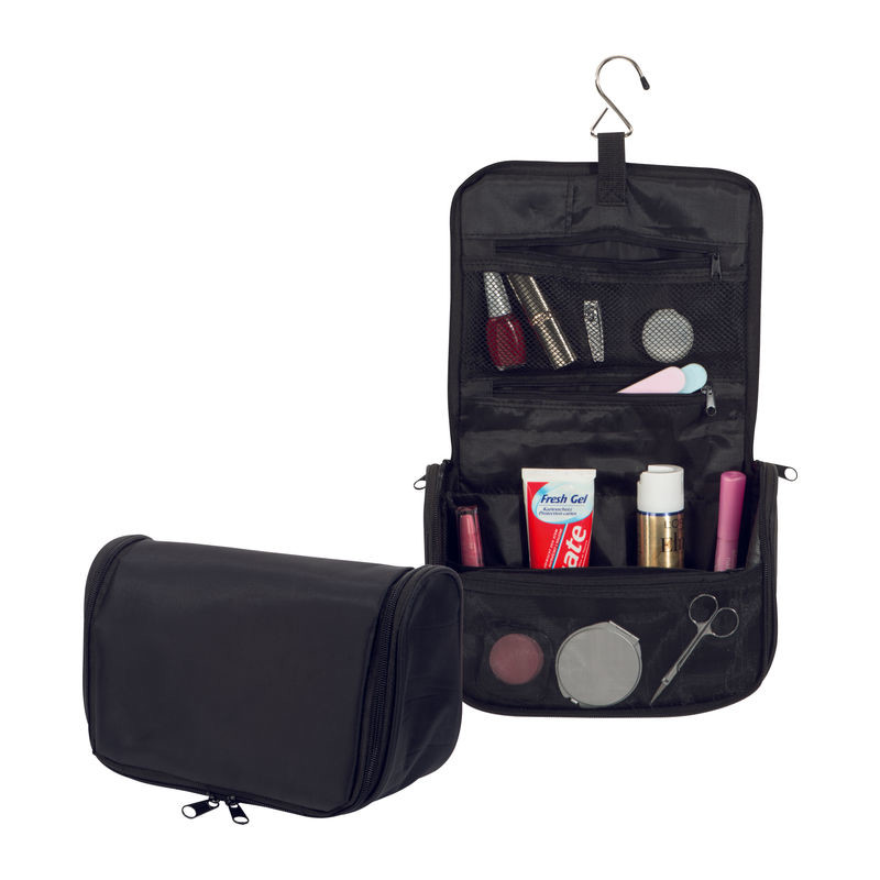 Toaletna torba od 190T najlona s velikim unutarnjim pretincem, 3 pretinca s patentnim zatvaračem, 4 elastične trake i kukom za vješanje. Tiskamo vaš logotip na prednjoj strani.