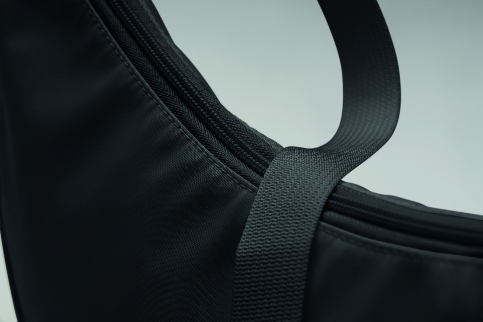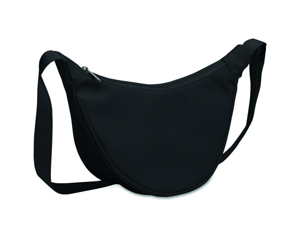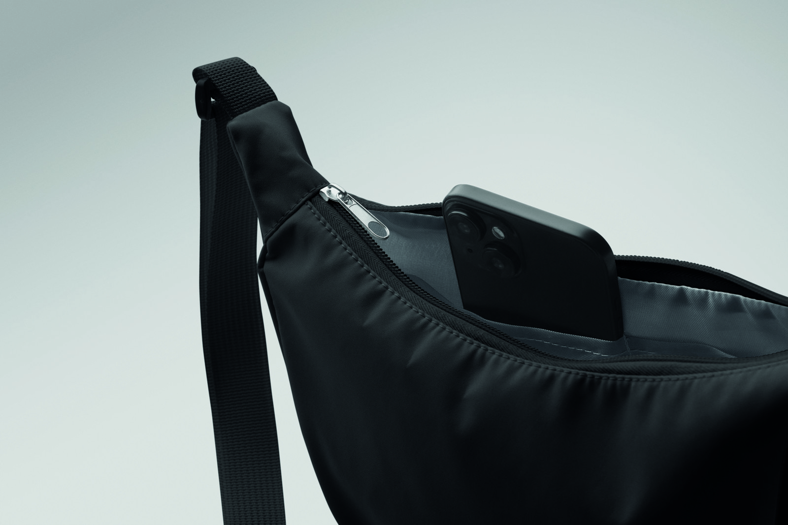 Torba za nošenje preko tijela u obliku polumjeseca od 400D Oxforda i podstave od 210D RPET-a. Jedan glavni džep s patentnim zatvaračem i 2 unutarnja džepa.