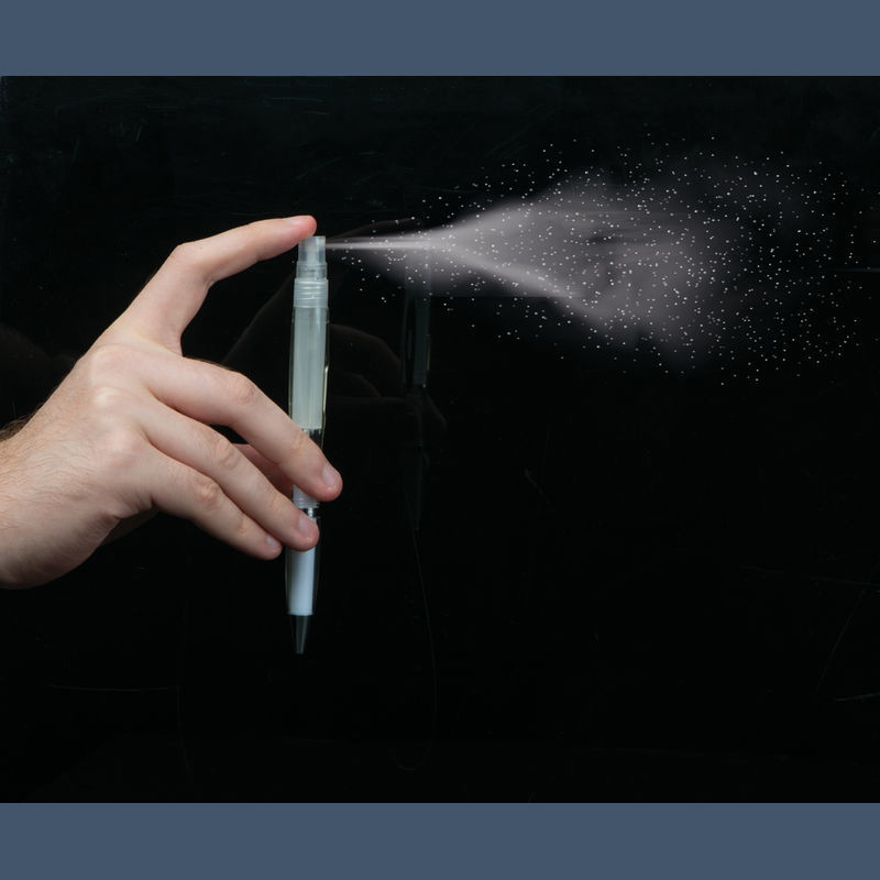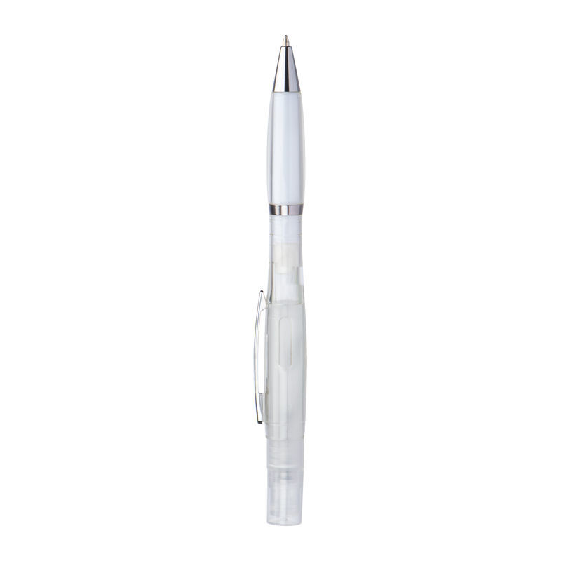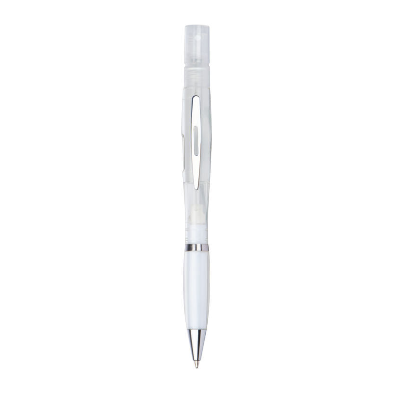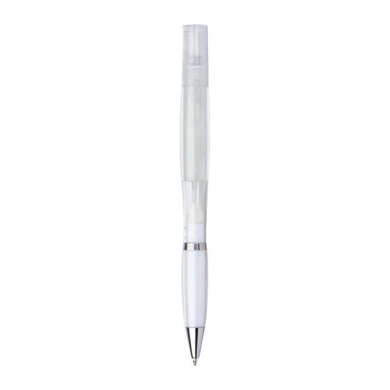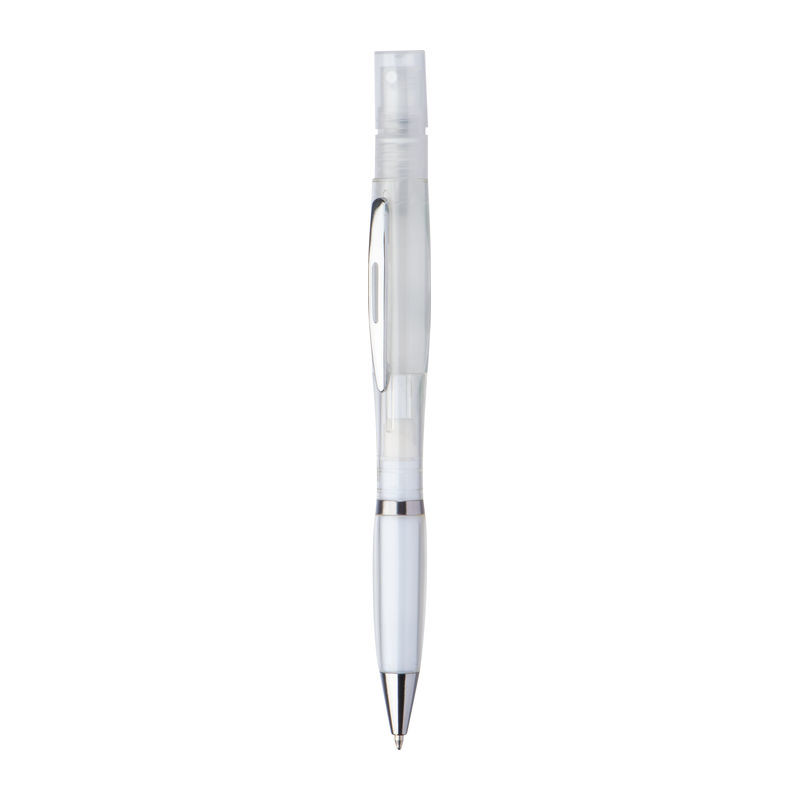 Prozirna olovka Twistpen sa srebrnim aplikacijama i plavim punjenjem. Raspršivač se može ponovno puniti - idealan za parfeme ili dezinfekcijske tekućine. Vaš logotip tiskamo na desnu stranu kopče.