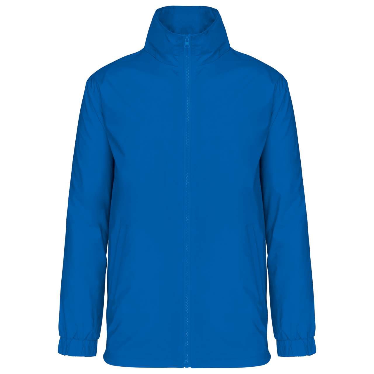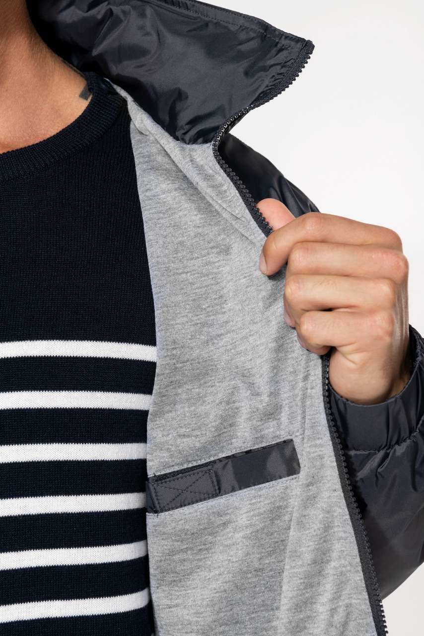 100 % poliamid 210T s akrilnim premazom Podstava od 100 % poliesterskog žerseja zagasite sive boje Skrivena kapuljača s elastičnom uzicom Patentni zatvarač cijelom visinom prednjice 1 unutarnji džep i 2 prednja džepa Elastična uzica za zatezanje na porubu Pristup za dodavanje ukrasa s pomoću zatvarača
