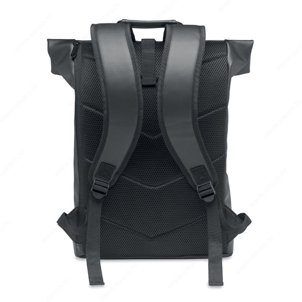 15-inčni rolltop ruksak za prijenosno računalo od mekanog PU s podstavljenim leđima i ojačanom bazom. Veliki prednji džep s patentnim zatvaračem. Podstava je 210D RPET.