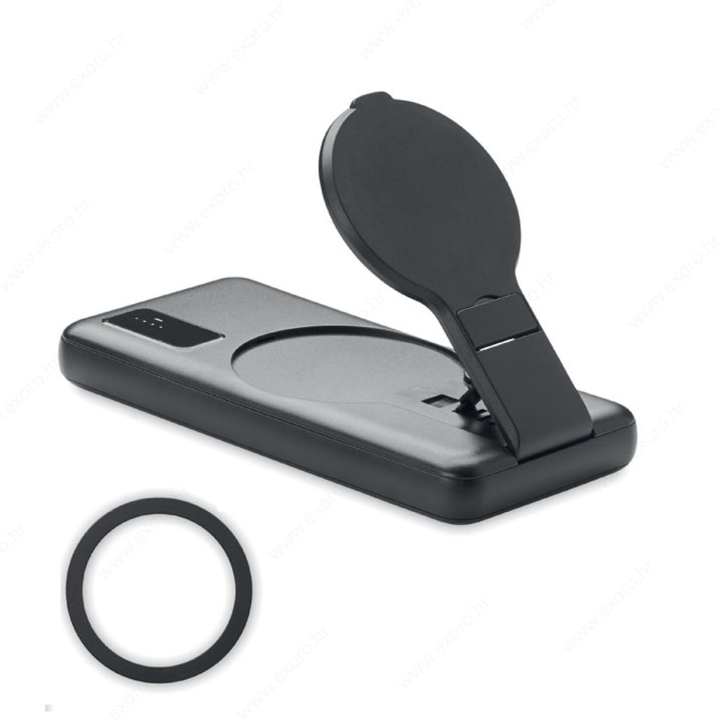 Magnetski bežični punjač (15W), power bank (10000 mAh) od ABS-a i funkcionalnost magnetskog stalka za telefon. Ulaz: mikro B, tip-C. Izlaz 2x USB-A ulaz/ Type-C/ DC 9V/1,66A (15W) idealan za brzo punjenje. Kompatibilan s iPhone® 12 i novijim. Uključuje dodatni magnetski metalni prsten za podršku punjenja nemagnetskih bežičnih telefona koji se mogu puniti. Podrška za napajanje (PD) za punjenje najnovijeg prijenosnog računala MacPro®.