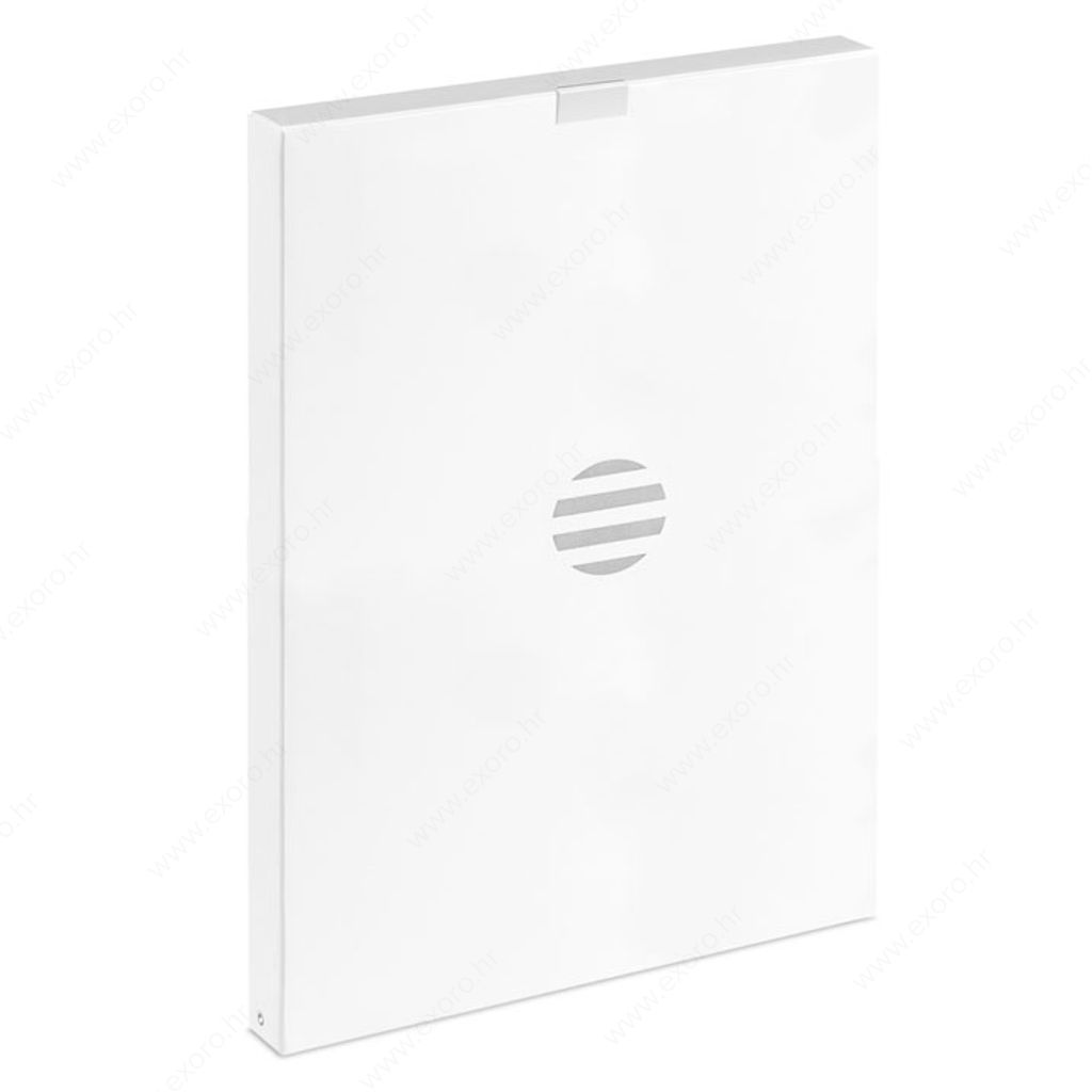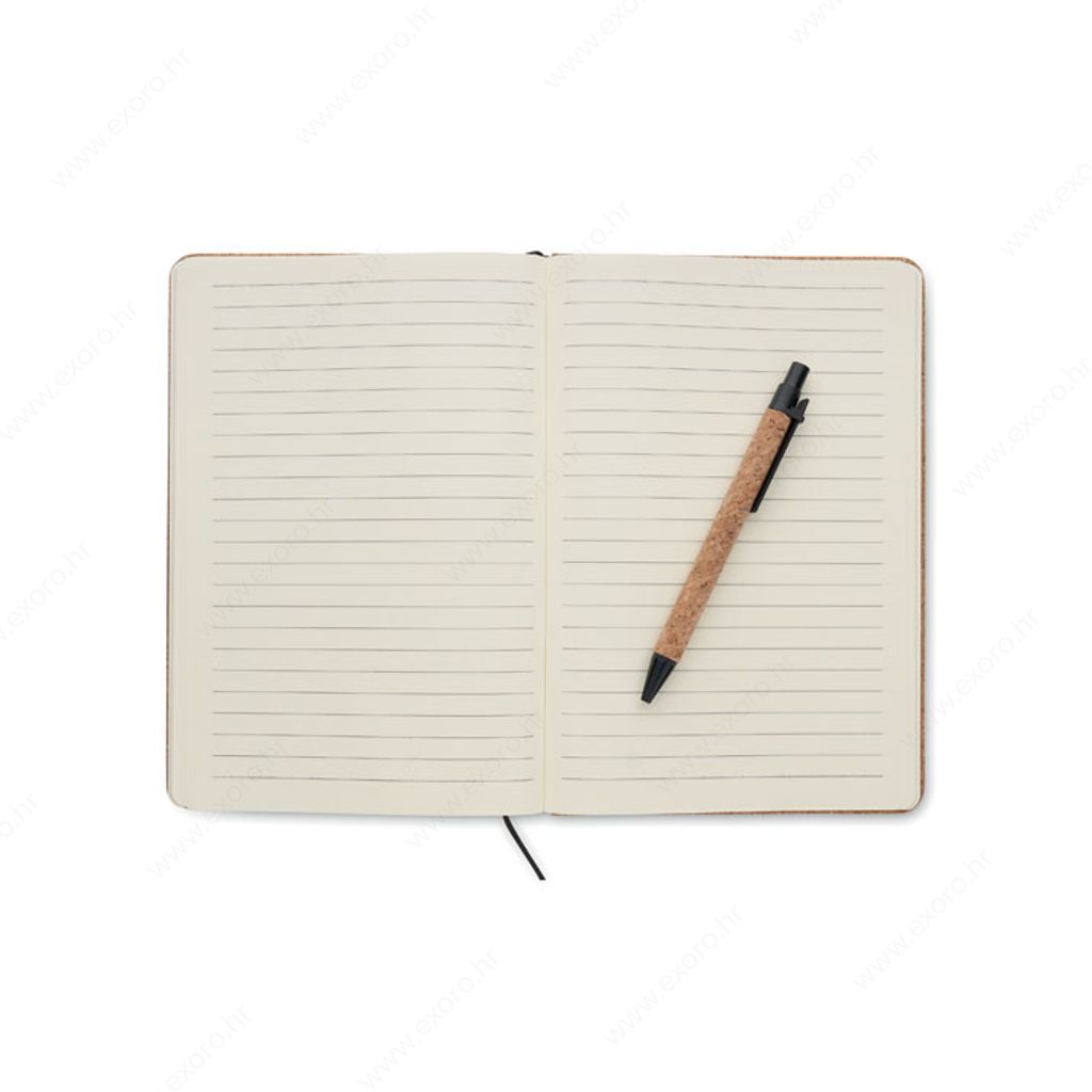 A5 pluteni portfolio. A5 bilježnica s mogućnošću ponovnog punjenja i tvrdim plutenim koricama. Uvezana. 192 stranice s linijama od recikliranog papira (96 listova). Odgovarajuća olovka i držač za olovke. 2 držača za kartice i jedan veliki pretinac. Elastična traka za zatvaranje.